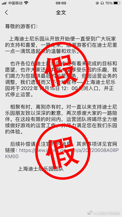 11月18日,@上海迪士尼度假区官方微博发布消息称,以下截图为假消息。上海迪士尼度假区已于2022年11月17日启动第一阶段重新开放,迪士尼小镇、星愿公园和上海迪士尼乐园酒店已恢复运营。目前度假区团队正在准备主题乐园——上海迪士尼乐园的重新开放,一旦开放日期确定,我们将及时告知游客。
