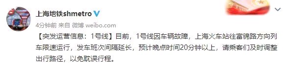 据上海申通地铁集团有限公司官方微博消息,目前,1号线因车辆故障,上海火车站往富锦路方向列车限速运行,发车班次间隔延长,预计晚点时间20分钟以上,请乘客们及时调整出行路径,以免耽误行程。