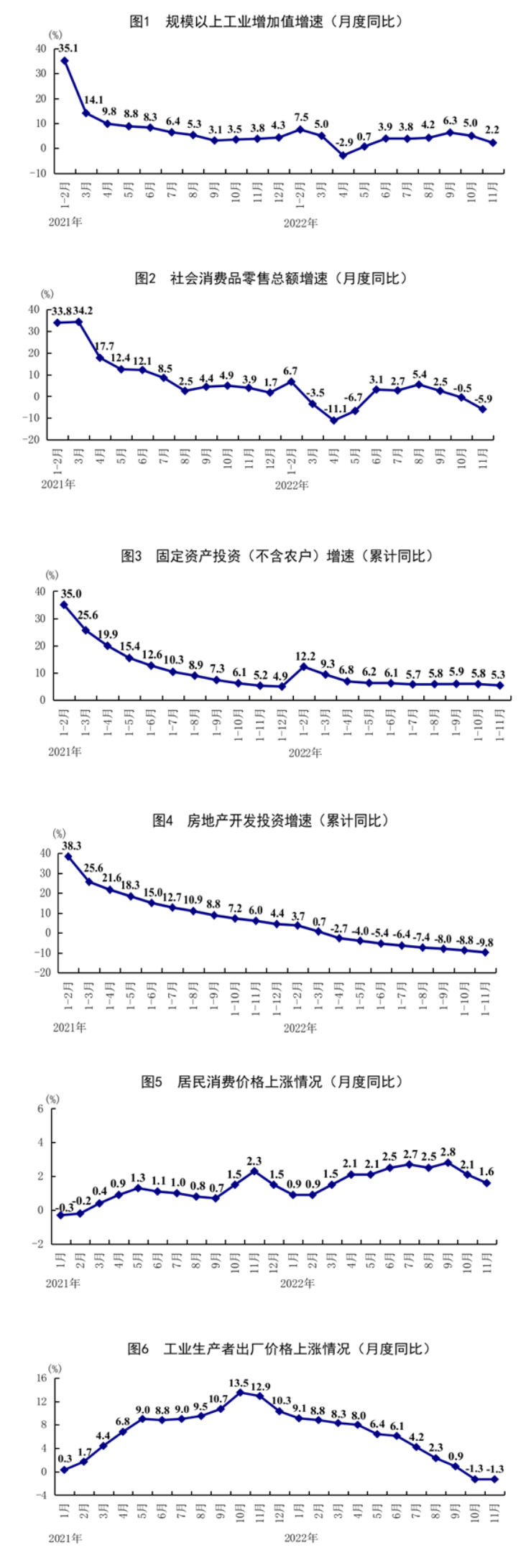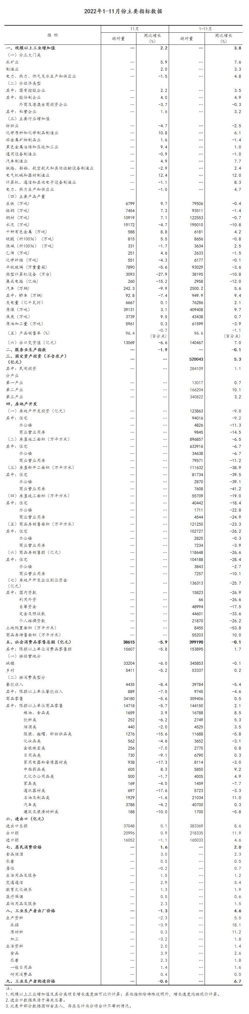 总的来看,11月份国民经济顶住国内外多重超预期压力,保持恢复态势,总体运行在合理区间。但国际环境更趋复杂严峻,国内经济恢复基础仍不牢固。下阶段,要坚持以习近平新时代中国特色社会主义思想为指导,坚决贯彻落实党的二十大精神,坚持稳中求进工作总基调,完整、准确、全面贯彻新发展理念,加快构建新发展格局,着力推动高质量发展,更好统筹疫情防控和经济社会发展,更好统筹发展和安全,全面深化改革开放,大力提振市场信心,扎实落实稳经济各项政策措施,着力稳增长、稳就业、稳物价,着力激发市场活力,推动经济运行整体好转。