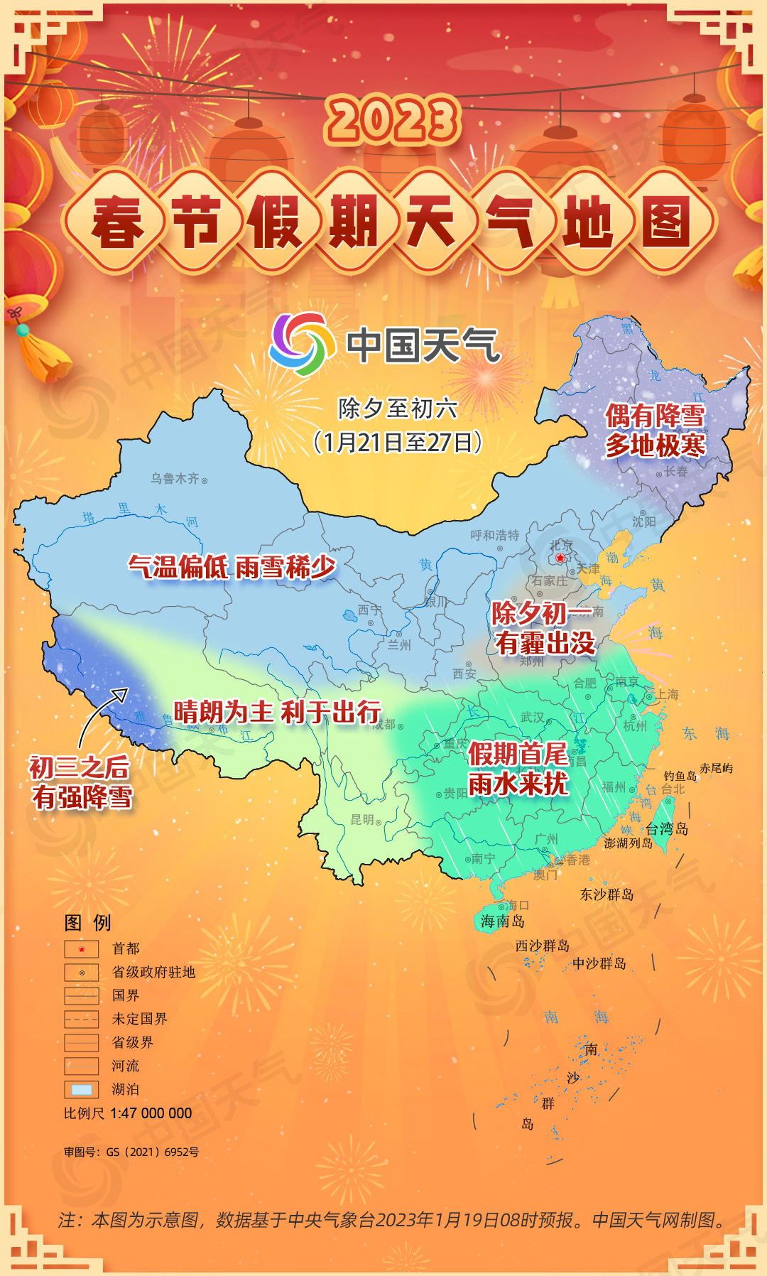 今天上午,中央气象台正式发布春节假期天气预报,预计2023年春节假期(除夕至初六)我国无大范围低温雨雪冰冻等灾害天气,冷空气活动较为频繁,中东部地区气温波动较大,内蒙古东部、东北一带气温偏冷明显,部分地区将现极寒。南方多地雨水中迎新春,除夕、初一及初五前后会有阴雨,需注意出行安全。