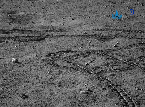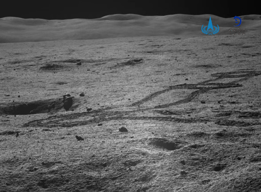 可以看到月球的地形地貌坑坑洼洼,路况还是比较差的。这个是玉兔二号已经行驶过的车辙印,它在这个区域进行了一个爬坡,随后它开始进入相对平缓的路段,可以看到非常清晰的车辙印。