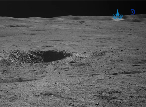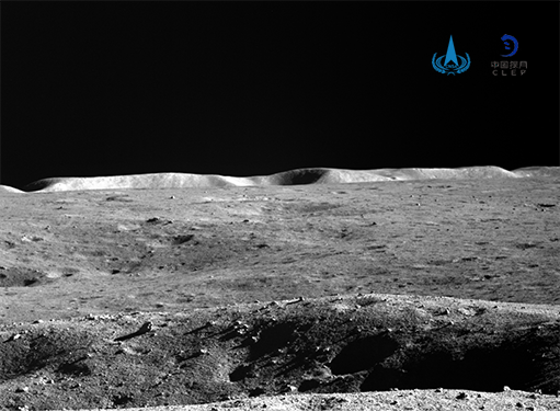 △第49月昼期间,当玉兔二号月球车行驶至LE04905点时,全景相机拍摄的撞击坑边缘隆起,远处还可以看到接着天际线的冯卡门坑边缘。