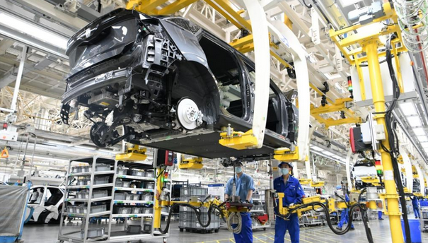 2月7日,工人在上汽集团乘用车福建宁德基地总装车间生产线上进行车身零部件组装。新华社 图