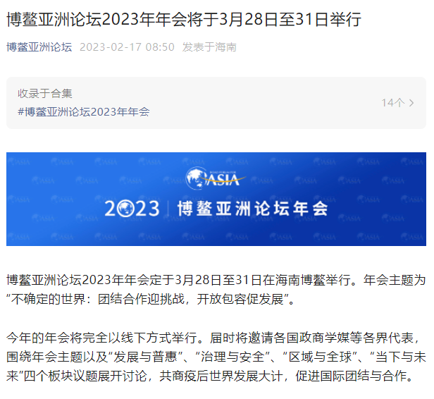 据“博鳌亚洲论坛”公众号消息,博鳌亚洲论坛2023年年会定于3月28日至31日在海南博鳌举行。年会主题为“不确定的世界:团结合作迎挑战,开放包容促发展”。