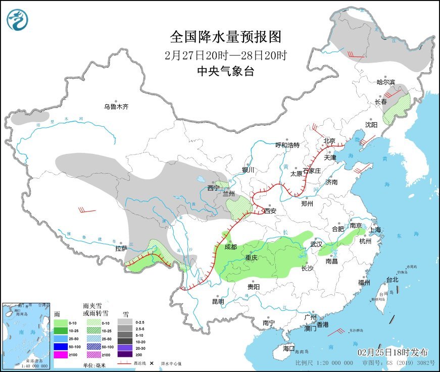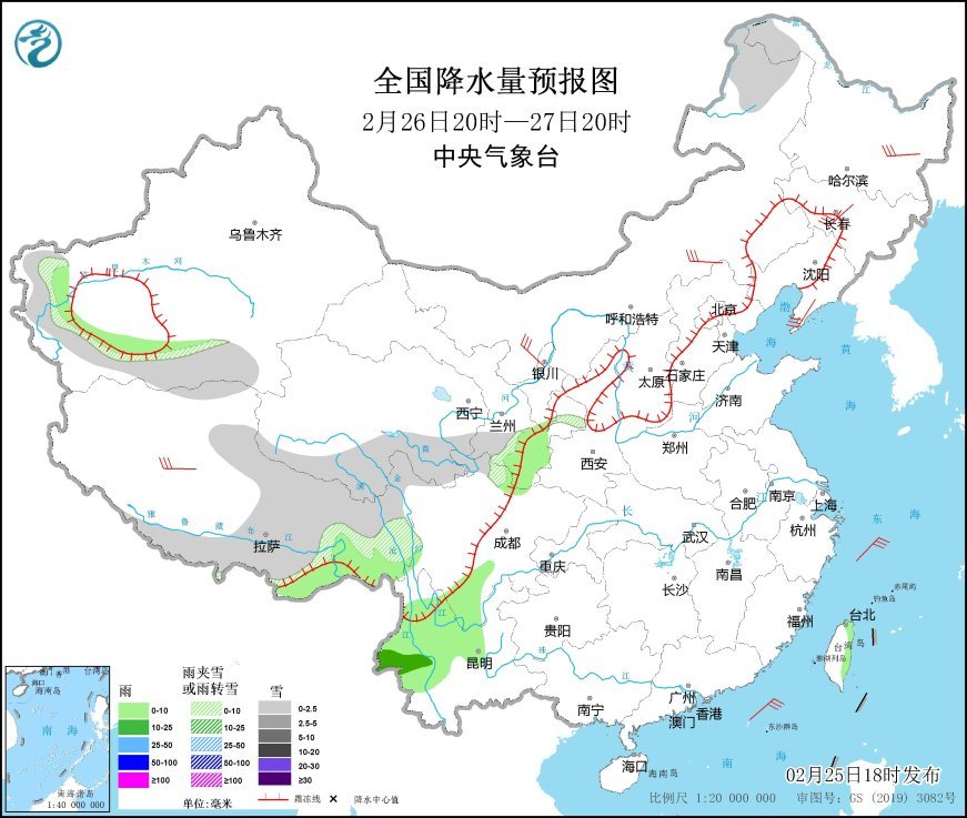 图1 全国降水量预报图(2月25日20时-26日20时)