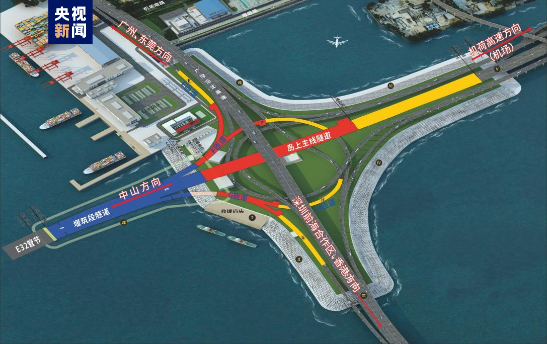 作为国内首个高速公路水下互通立交,东人工岛采用了“一体两翼”的布局,与海底沉管隧道相连接,并实现项目与广深沿江高速等路网的高效顺畅衔接。未来经深中通道东人工岛,可东往惠州、深圳龙岗区,西往中山、珠海,北往广州、东莞,南往深圳前海合作区、香港方向,充分发挥项目作为粤港澳大湾区核心交通枢纽的重要作用,推动大湾区主要城市间一小时生活圈的形成。