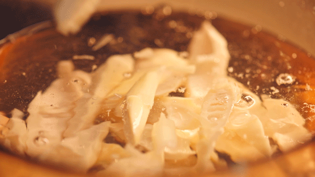 大火烧开,小火慢炖,再加入百叶结、莴笋……一锅“鲜得眉毛掉下来”的腌笃鲜,就这样“笃”好了。