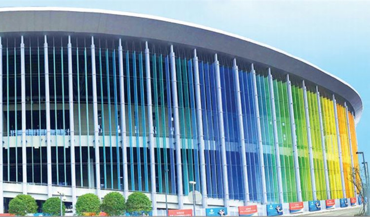 为迎接首届中国国际进口博览会,国家会展中心(上海)穿上了彩色外衣,格外亮眼。本报记者 赵立荣 摄。视觉设计:冯晓瑜