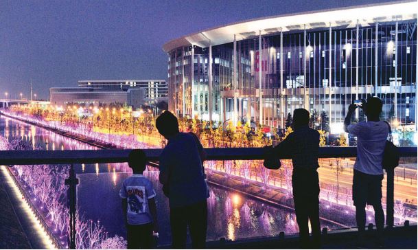 国家会展中心(上海)周边以及虹桥商务区的灯光景观照明进入调试阶段,营造出一派流光溢彩的景象。本报记者赵立荣摄