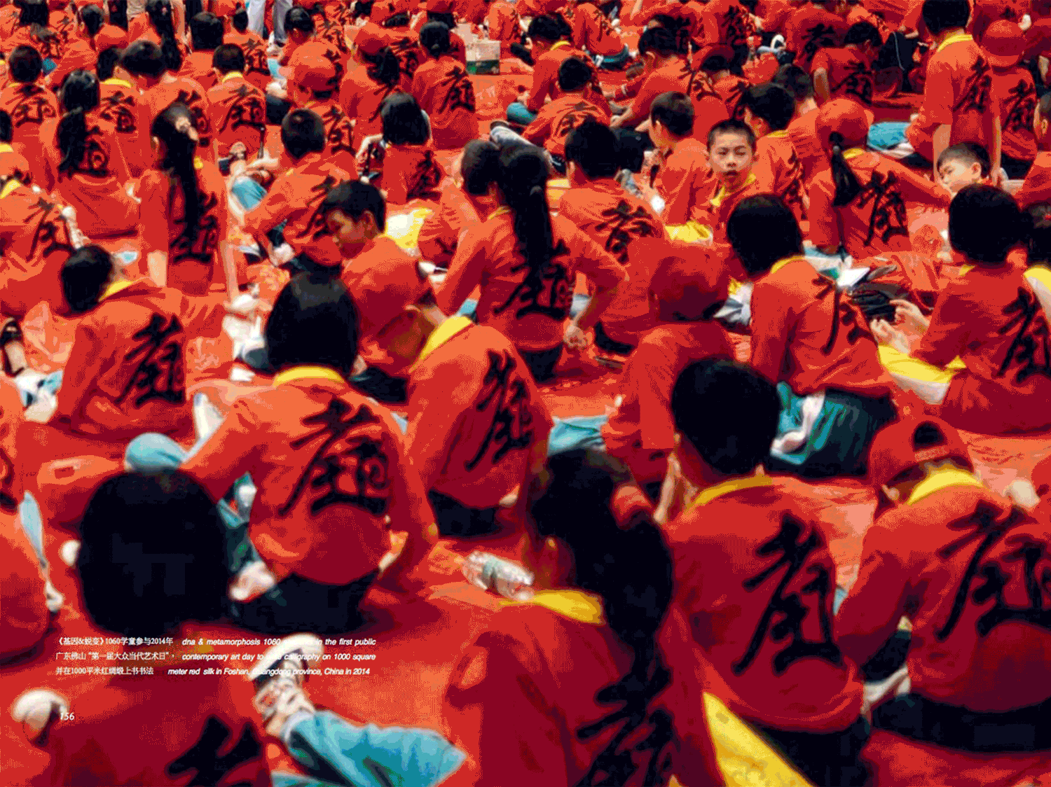 2014年在佛山,谷文达和企业合作,在母亲节当天邀请了1060个三年级儿童,在一千平方米的红绸上写《孝经》并剪发祭祖;2016年在深圳会展中心,邀请1500位学童穿着印有“青山绿水”字样的白T恤,用蓝藻水在1500平米的宣纸上泼画。