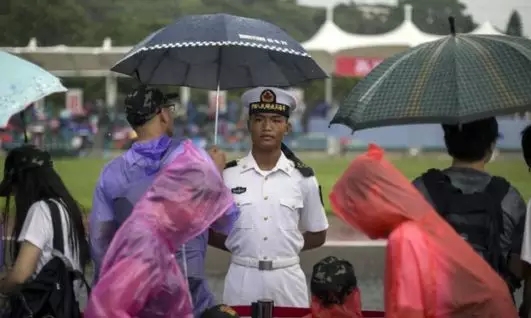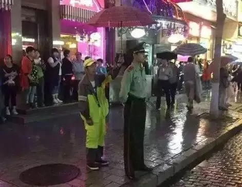 磅礴雨中,人们撑起了手中的雨伞,举过了战士们的头顶。