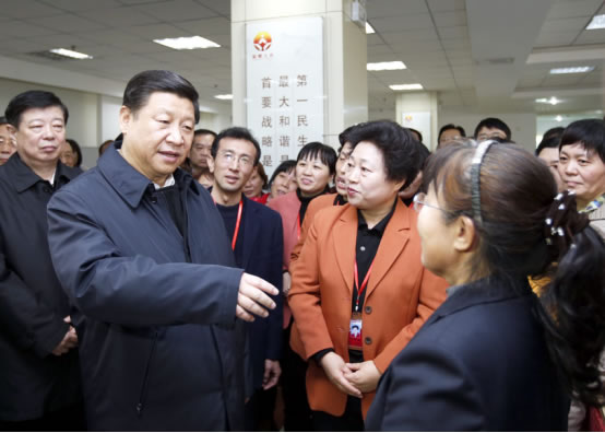2013年11月27日,习近平在山东省济南市外来务工人员综合服务中心同从事家政服务的“阳光大姐”交流。来源:新华社