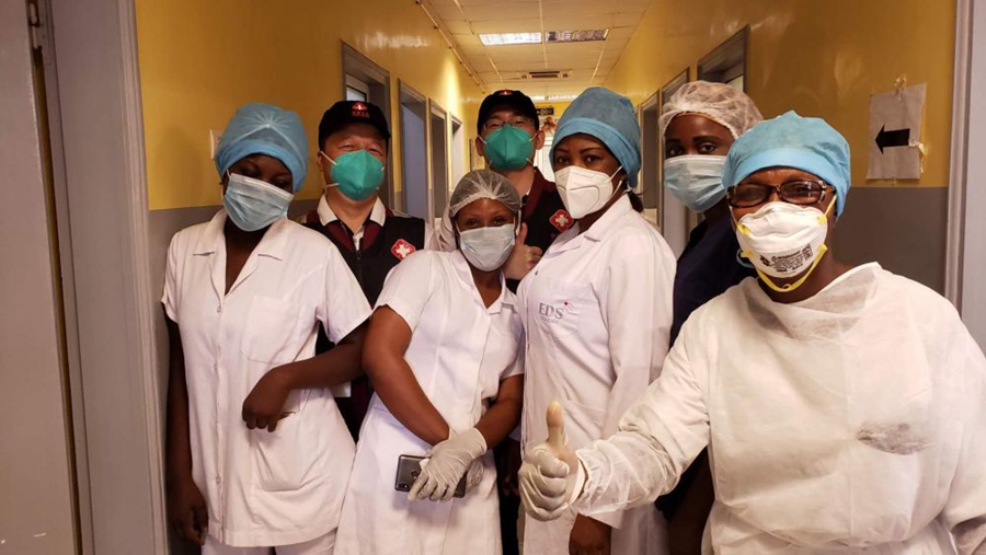 5月26日,在刚果(布)首都布拉柴维尔,中国抗疫医疗专家组与当地一线医务人员交流,指导新冠肺炎病房建设。新华社发