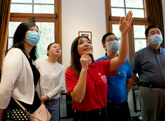 2020年6月30日,复旦大学《共产党宣言》展示馆党员志愿服务队队员、复旦大学马克思主义学院博士生陆婷婷(中)在为观众讲解。