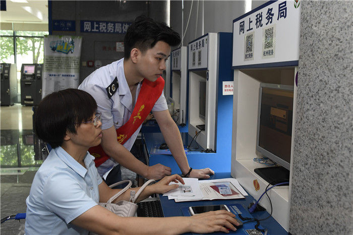 在工作人员的协助下,办税人在国家税务总局杭州市富阳区税务局网上办税厅体验区办理涉税业务(2018年7月25日)。新华社记者 黄宗治 摄