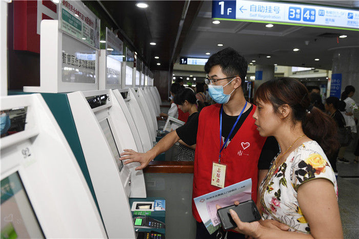 志愿者在杭州市第一人民医院挂号大厅帮助患者使用智慧医疗多功能自助机挂号、缴费(2018年7月23日摄)。新华社记者 黄宗治 摄