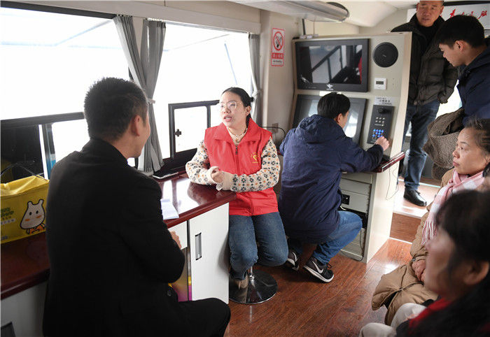 浙江安吉孝源街道洛四房村一名返乡创业企业主向流动服务车工作人员询问创业政策支持(1月15日摄)。新华社记者 翁忻旸 摄