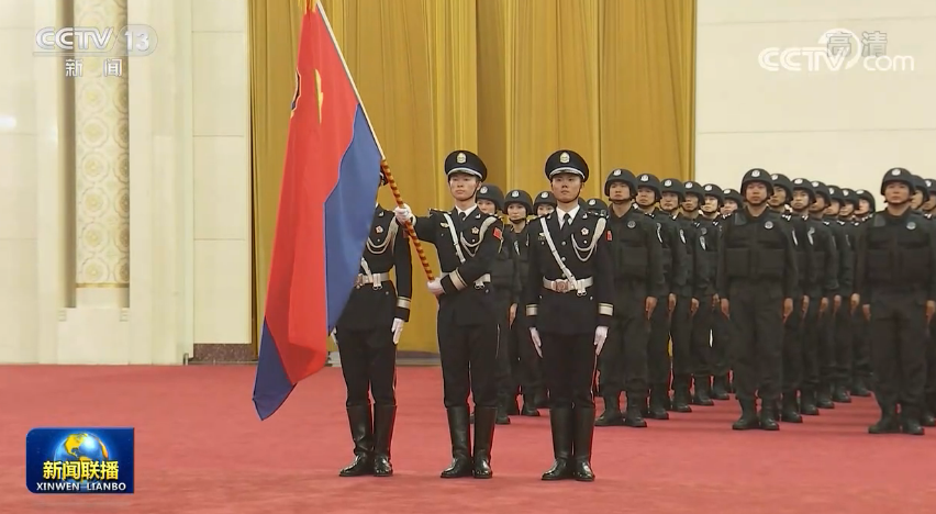 人民大会堂北大厅气氛隆重热烈。红色背景板上,“中国人民警察警旗授旗仪式”字样格外醒目。300余名身着警礼服、特警战训服的人民警察身姿挺拔、精神抖擞,整齐列队。