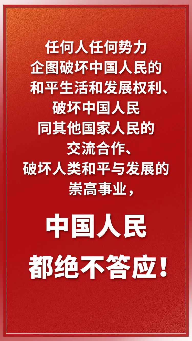 ——实现中华民族伟大复兴,必须坚定不移走和平发展道路。近代以后,中国人民遭受列强的侵略、凌辱、掠夺达百年以上,但中国人民不是从中学到弱肉强食的强盗逻辑,而是更加坚定了维护和平的决心。人类命运休戚与共,各国人民应该秉持“天下一家”理念,共同推动构建人类命运共同体。中国人民热爱和平、珍惜和平,把维护世界和平、反对霸权主义和强权政治作为自己的神圣职责,坚决反对动辄使用武力或以武力威胁处理国际争端,坚决反对打着所谓“民主”、“自由”、“人权”等幌子肆意干涉别国内政。中国人民将一如既往同各国人民携手努力,为创造人类美好未来而不懈奋斗。任何人任何势力企图破坏中国人民的和平生活和发展权利、破坏中国人民同其他国家人民的交流合作、破坏人类和平与发展的崇高事业,中国人民都绝不答应!