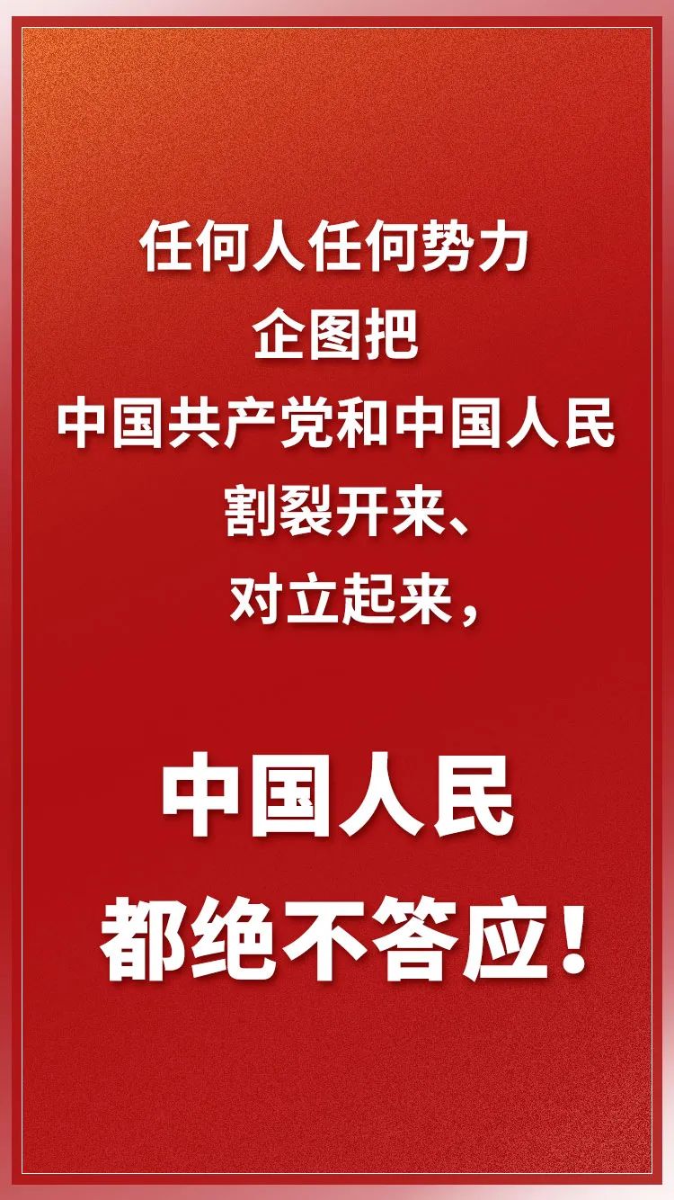 ——实现中华民族伟大复兴,必须坚持以人民为中心。人民是历史的创造者,是决定党和国家前途命运的根本力量。中国共产党来自人民、植根人民,初心和使命是为中国人民谋幸福、为中华民族谋复兴,根本宗旨是全心全意为人民服务。我们要坚持一切为了人民、一切依靠人民,保持同人民的血肉联系,紧紧依靠人民开拓事业新局面,促进全体人民共同富裕。任何人任何势力企图把中国共产党和中国人民割裂开来、对立起来,中国人民都绝不答应!