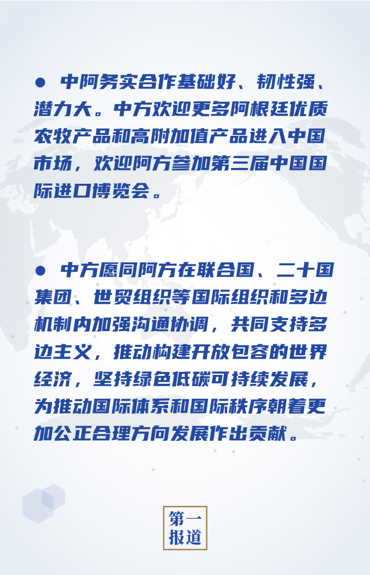 习近平强调,中方高度重视同阿根廷的关系,支持阿方发展经济、改善民生,对中阿合作未来充满信心。中国将全面提高对外开放水平,推动形成以国内大循环为主体、国内国际双循环相互促进的新发展格局。这将为包括阿根廷在内的世界各国提供广阔市场和发展机会。中阿务实合作基础好、韧性强、潜力大。中方欢迎更多阿根廷优质农牧产品和高附加值产品进入中国市场,欢迎阿方参加第三届中国国际进口博览会。双方应落实好现有重大项目,开辟合作新疆域,深化人文交流,推动中阿全面战略伙伴关系取得更大发展。