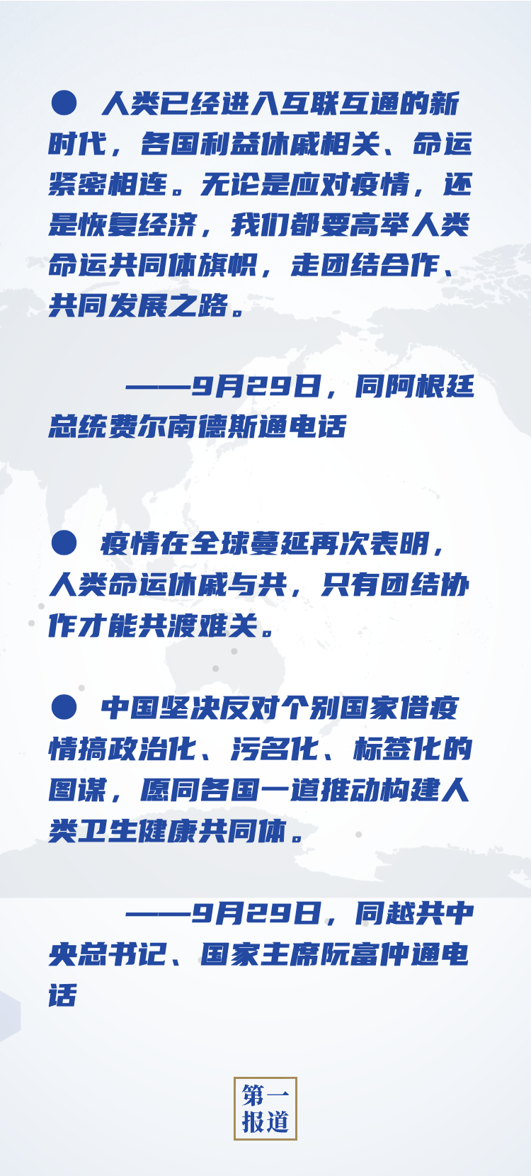 “团结合作是最有力的武器”“唯有相互支持、团结合作才是战胜危机的人间正道”……今年以来,面对疫情挑战,习主席在各种双多边场合反复提到“团结”一词,号召世界各国团结合作、共克时艰。9月22日,在第七十五届联合国大会一般性辩论上发表重要讲话时,习主席面向国际社会发出“让我们团结起来”的真诚呼吁。29日,在习主席同阿根廷、越南领导人的通话中,“团结”这一中国外交高频词再次出现: