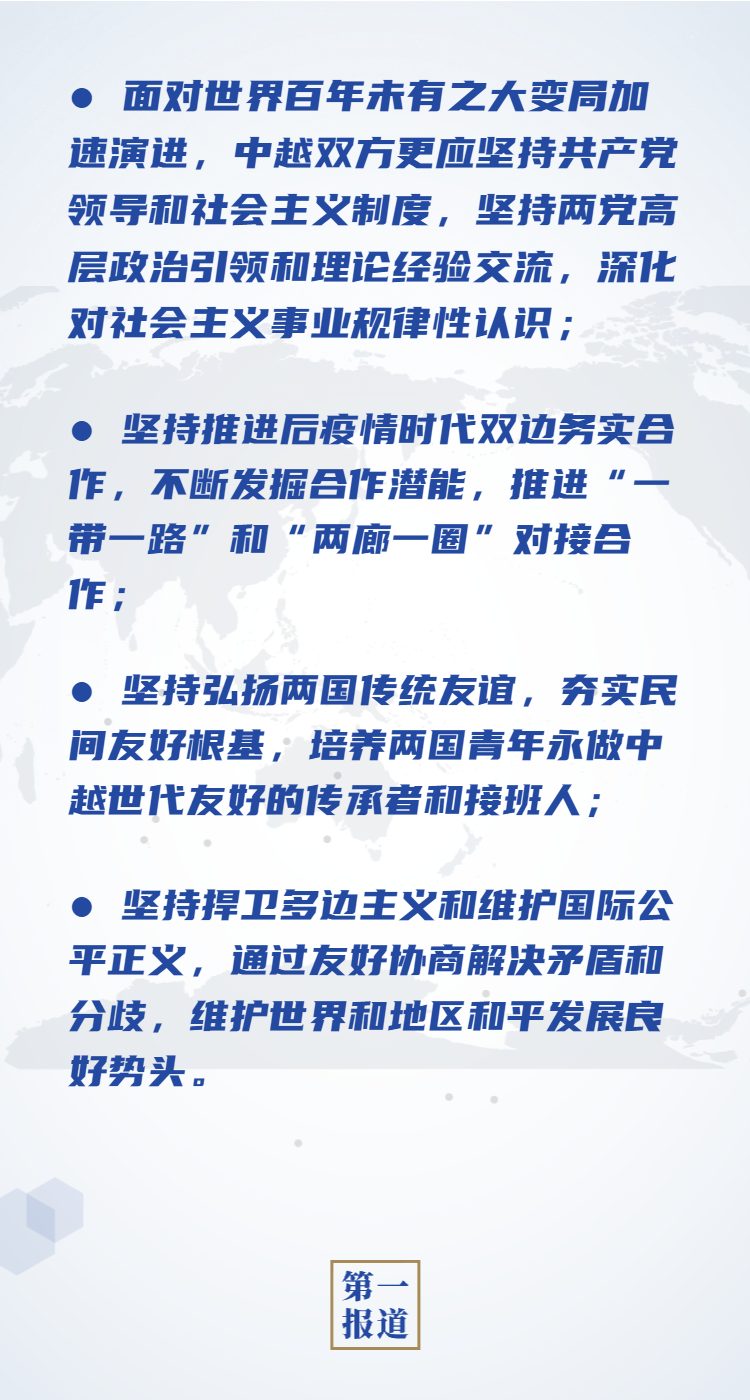 中越同为社会主义国家,两国在意识形态、发展道路、社会制度、价值理念等方面高度一致。面对世界百年未有之大变局加速演进,习近平对中越关系提出多项“坚持”: