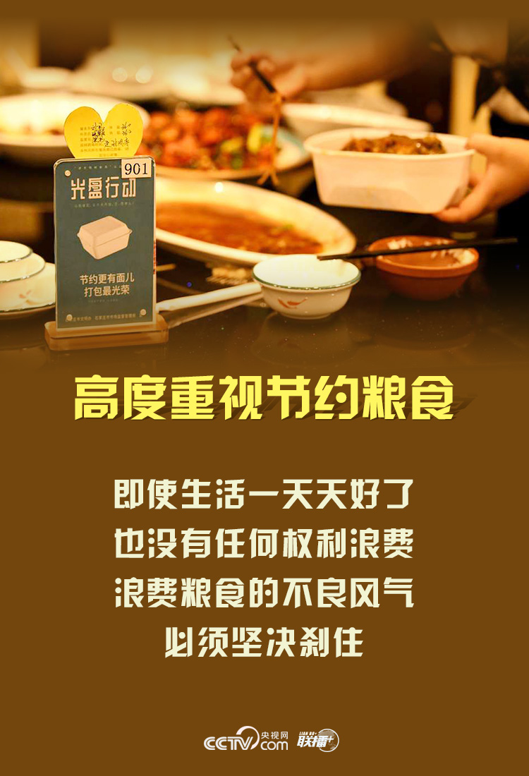 当前,受新冠肺炎疫情影响,全球范围内的饥饿人数有所增加,尽管我国的粮食生产连年丰收,但对粮食安全仍要有危机意识。适逢中秋、国庆双节宴请高峰期,牢记“勤俭是我们的传家宝”,珍惜盘中餐,和总书记一起对浪费说“不”!