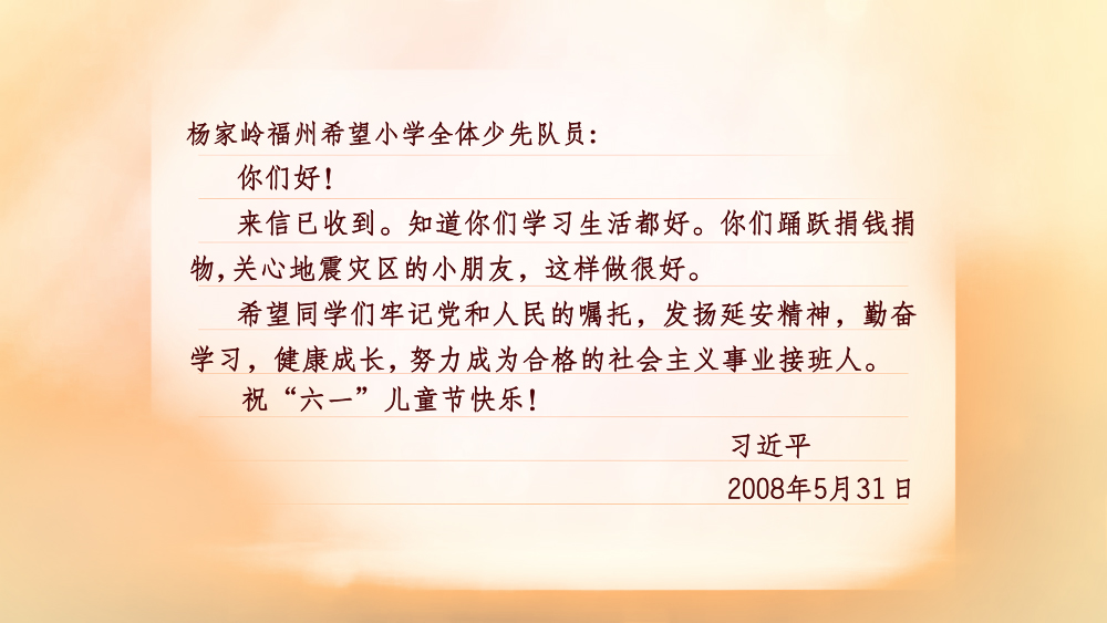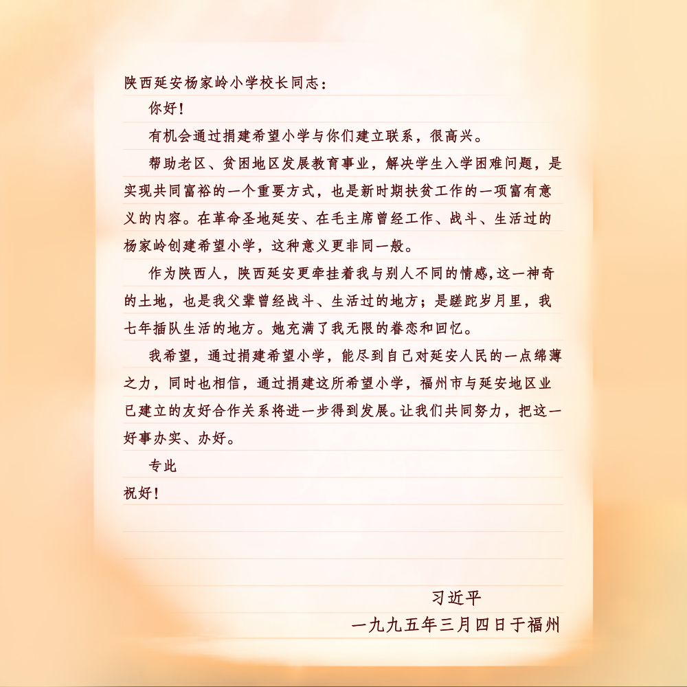 2008年5月21日,杨家岭福州希望小学的孩子们给时任国家副主席的习近平写信,汇报他们向汶川灾区小朋友捐款捐物和自己日常学习生活情况。10天后,他们收到了回信。信中,习近平勉励他们发扬延安精神,勤奋学习,健康成长,努力成为社会主义事业接班人。