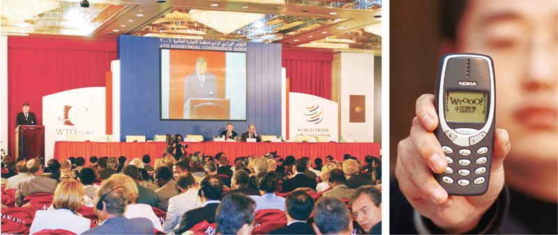 2001年11月10日,在卡塔尔首都多哈,世界贸易组织第四届部长级会议全体协商一致,审议并通过了中国加入世贸组织的决定。左图为大会现场(新华社记者 王建华/摄);右图为当时受到众多用户欢迎的手机短信图片。
