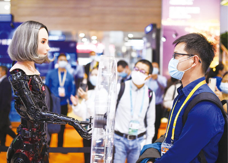中国国际进口博览会,是世界上第一个以进口为主题的国家级展会,是中国主动向世界开放市场的重大举措。2020年11月5—10日,第三届进博会在上海成功举行。图为11月6日,在技术装备展区,一名观众与EX仿生机器人对视。