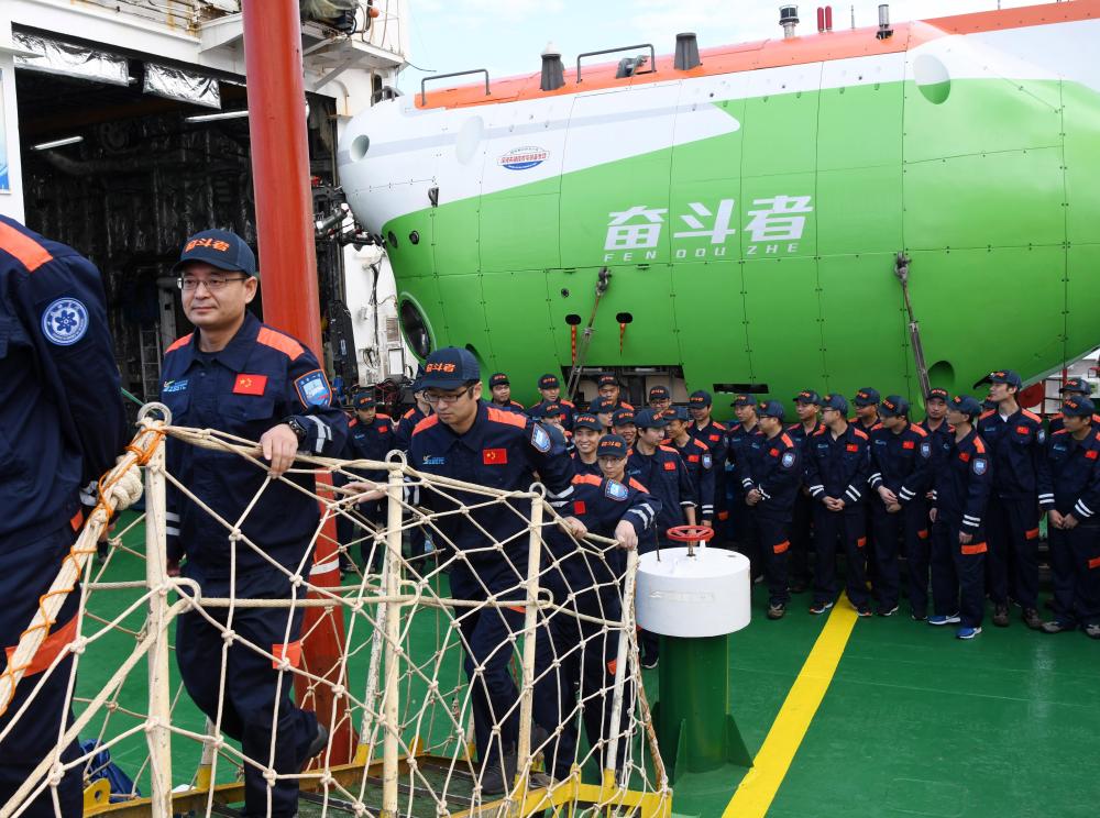 11月28日,在海南省三亚市南山港,在马里亚纳海沟成功实现10909米坐底纪录的“奋斗者”号载人潜水器随“探索一号”科考船胜利返航。新华社记者 陈凯姿 摄