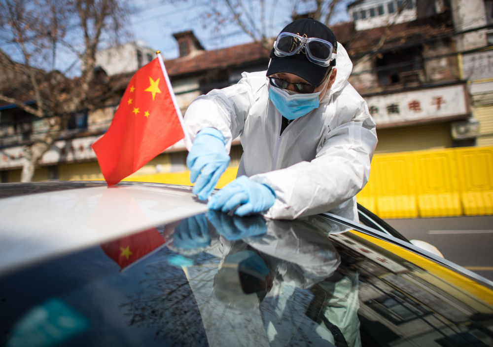 2月29日,“W大武汉紧急救援队”队员朱伟将国旗插在车上。疫情期间,由志愿者组成的“W大武汉紧急救援队”接送缺乏交通工具去医院的待产孕妇,成为即将出生的新生命的“摆渡人”。新华社记者 肖艺九 摄