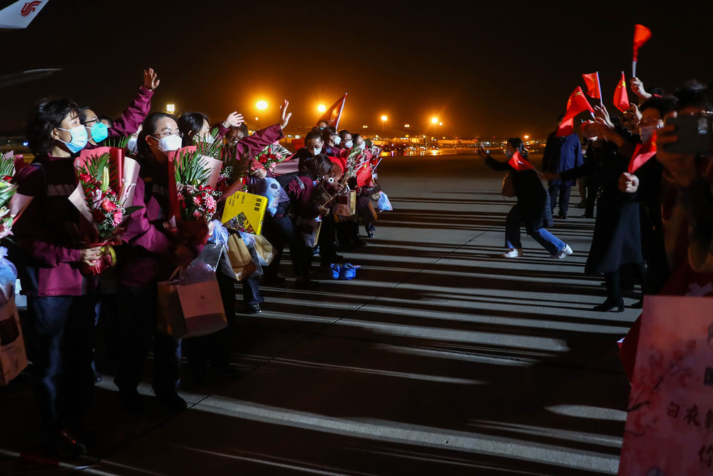 4月15日,北京协和医院国家援鄂抗疫医疗队队员在撤离前集结。面对突如其来的疫情,4万多名来自全国各地的医务工作者集结湖北,与当地医务人员一道,展开了一场艰苦卓绝的湖北保卫战。新华社记者 熊琦 摄