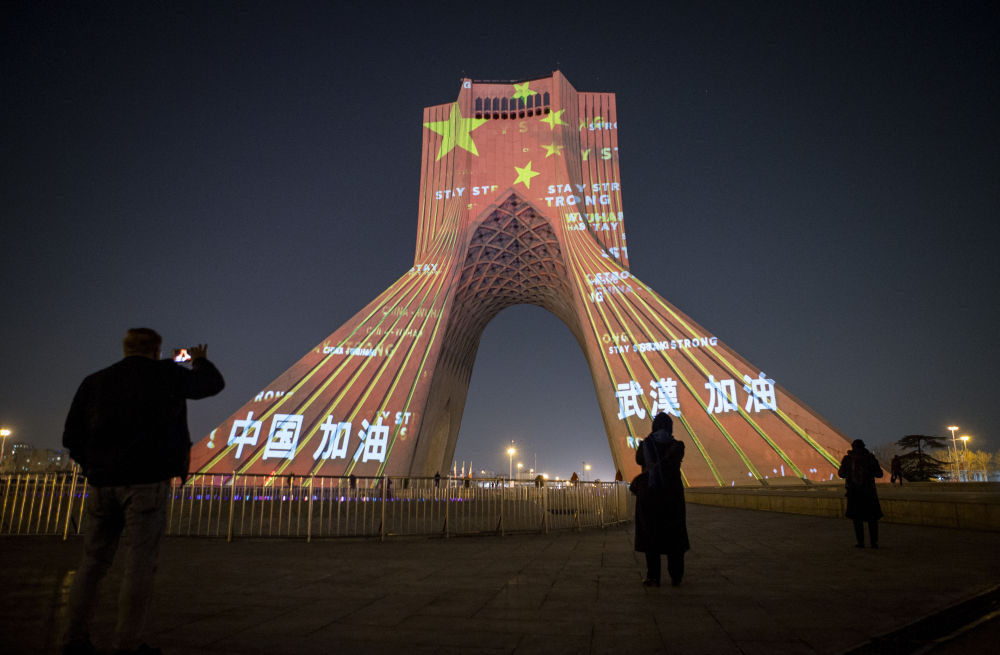 2月18日,伊朗首都德黑兰地标建筑自由塔上演灯光秀,为中国抗击疫情加油。新华社发(艾哈迈德·哈拉比萨斯摄)