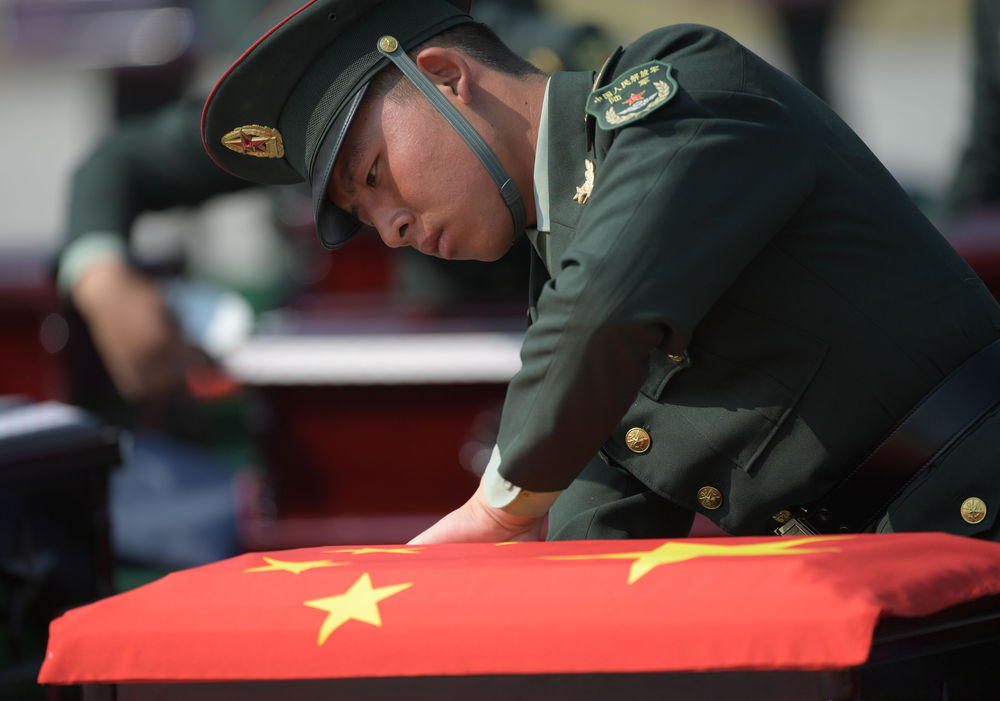 9月27日,在沈阳桃仙国际机场,礼兵在殓放志愿军烈士遗骸的棺椁上盖上国旗。当日,第七批在韩中国人民志愿军烈士遗骸由中国空军专机护送从韩国接回辽宁沈阳。新华社记者 杨青 摄