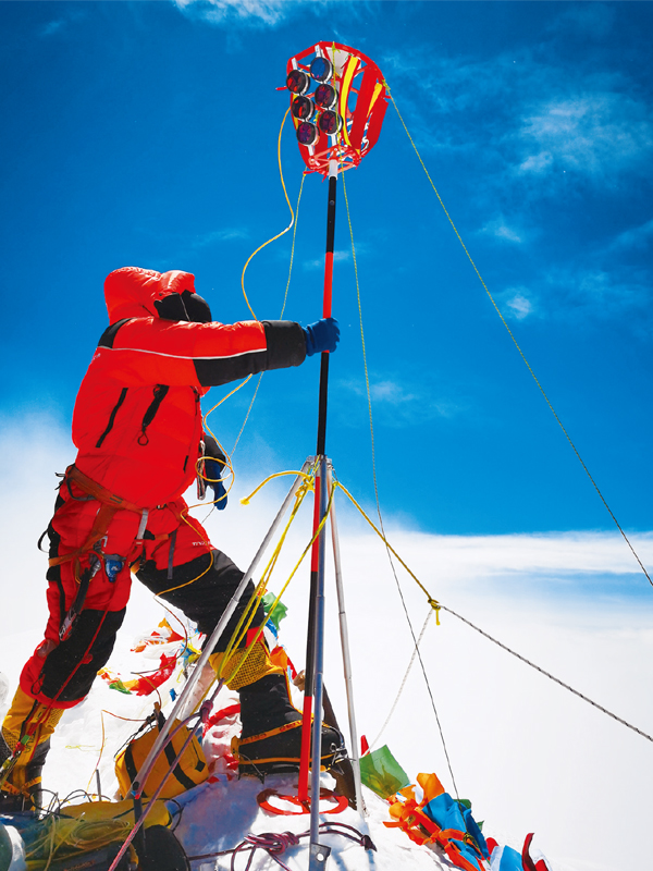 2020年12月8日,中国和尼泊尔共同向世界宣布,珠穆朗玛峰的最新雪面高程为8848.86米。2020珠峰高程测量,将我国自主研制的北斗卫星导航系统首次应用于珠峰峰顶大地高的计算,获取了更长观测时间、更多卫星观测数量的数据;GNSS接收机、长测程全站仪、重力仪等国产仪器全面担纲,指标精度达到了世界先进水平。图为2020年5月27日珠峰高程测量登山队队员在峰顶开展测量工作。 新华社特约记者 扎西次仁/摄