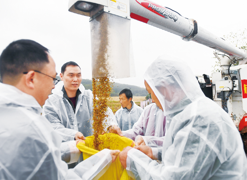 2020年11月2日,湖南衡南双季晚稻试验示范基地传来消息:由袁隆平院士团队培育的第三代杂交水稻“叁优一号”测产结果公布,双季亩产突破1500公斤。图为当日工作人员将稻谷装袋。 新华社记者 陈泽国/摄