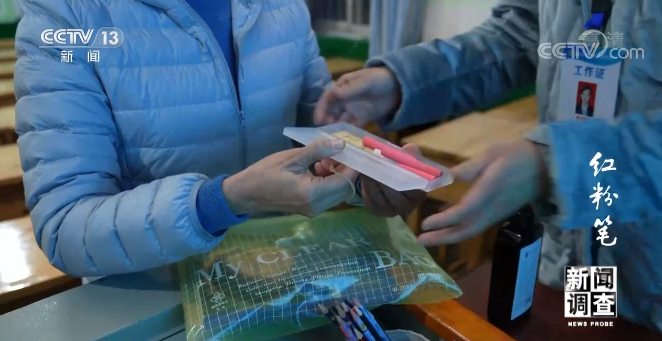 敬一丹再次采访戚谊老师时,送给她一份只有她俩能懂的特殊礼物:一盒红粉笔和白粉笔,戚老师顿时泪奔。