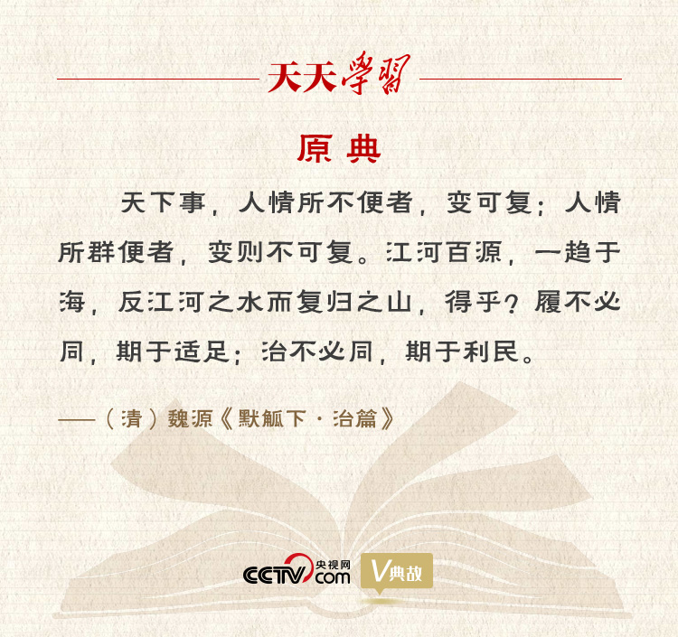 《默觚》是中国近代思想家魏源的哲学著作。魏源从历史自身的“自变性”去探求历史发展的驱动力,认为历史变化发展的标准是“便民”。为此,他用生动的比喻加以说明:“履不必同,期于适足;治不必同,期于利民。”意思是说,每一个人的鞋子大小不必相同,关键是要适合自己的脚;每个国家的治理方法不必雷同,关键是要有利于人民。