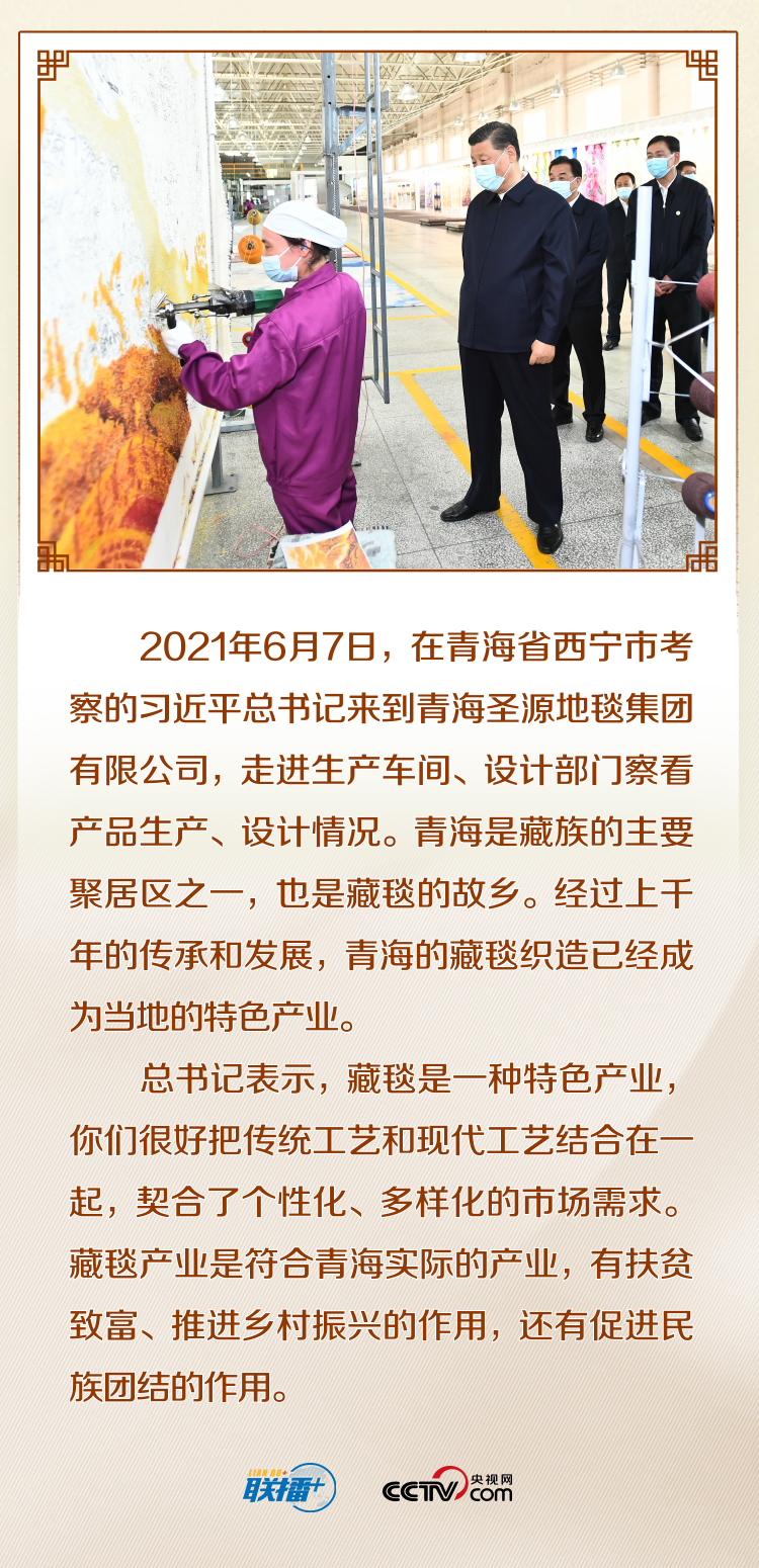 联播+6月7日下午,在青海省西宁市考察的习近平总书记来到青海圣源地毯集团有限公司,走进生产车间、设计部门察看产品生产、设计情况。青海是藏族同胞的主要聚居区之一,也是藏毯的故乡。经过上千年的传承和发展,青海的藏毯织造已经成为当地的特色产业。在这里,总书记为藏毯织造这一传统工艺点赞,并希望青海发展更多这样的特色产业,靠创新实现更好发展。