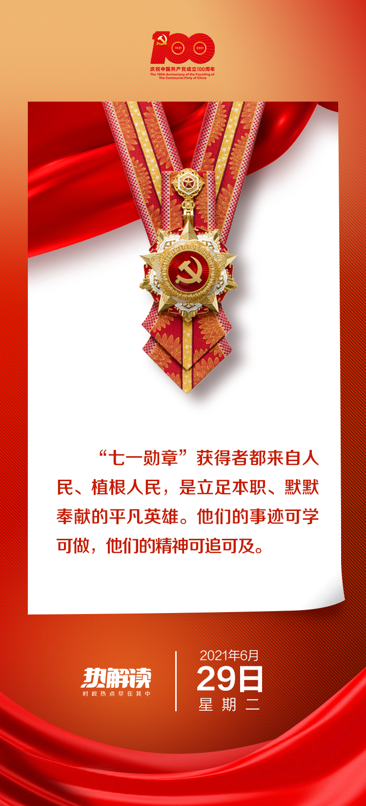 颁授仪式上,习近平总书记表示:“‘七一勋章’获得者都来自人民、植根人民,是立足本职、默默奉献的平凡英雄。”