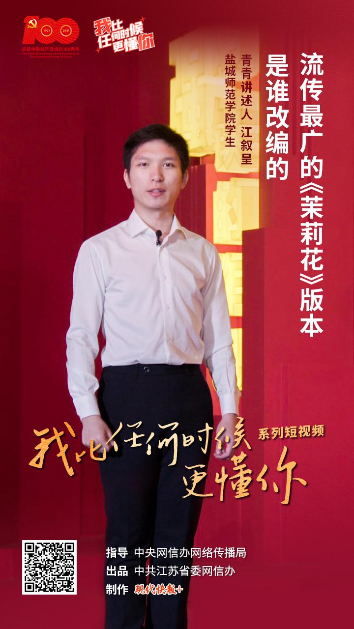 8 月 8 日," 我比任何时候更懂你 " 系列短视频第 15 集《流传最广的 < 茉莉花 > 版本是谁改编的?》上线,本集青青讲述人是盐城师范学院学生江叙呈。