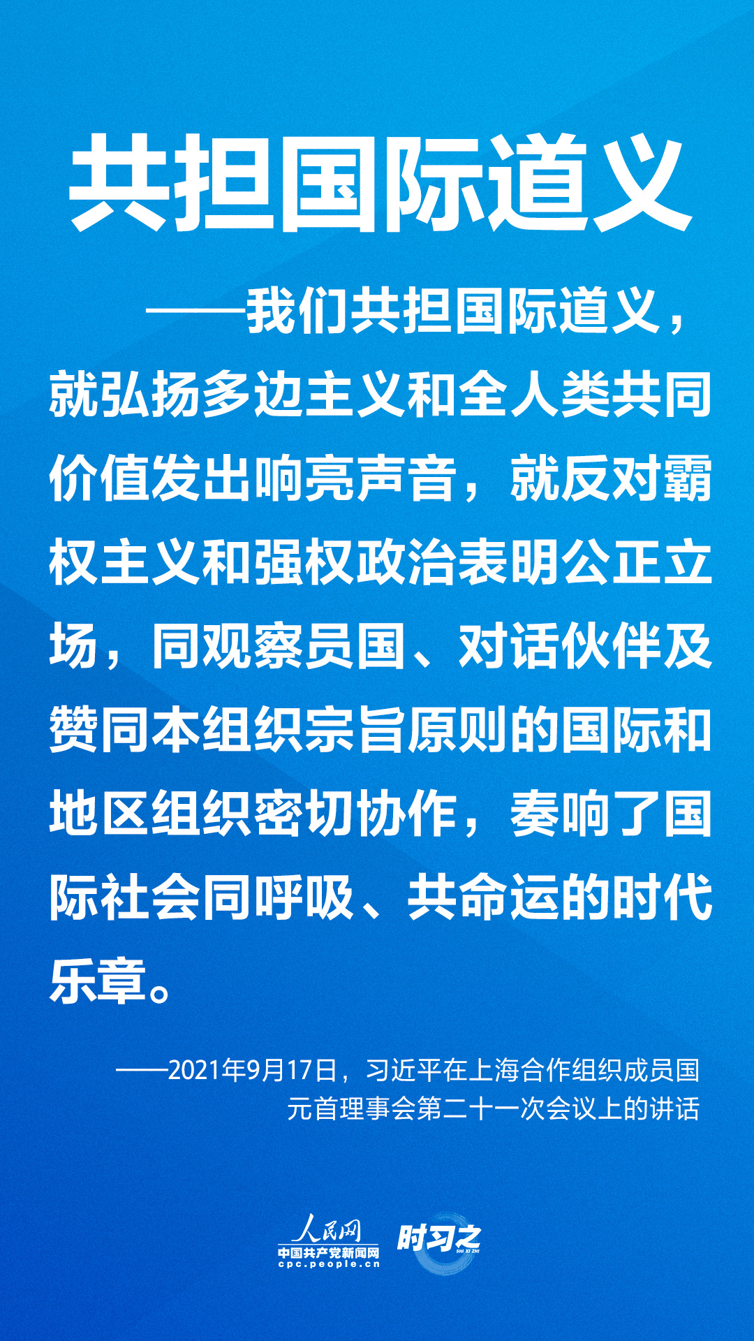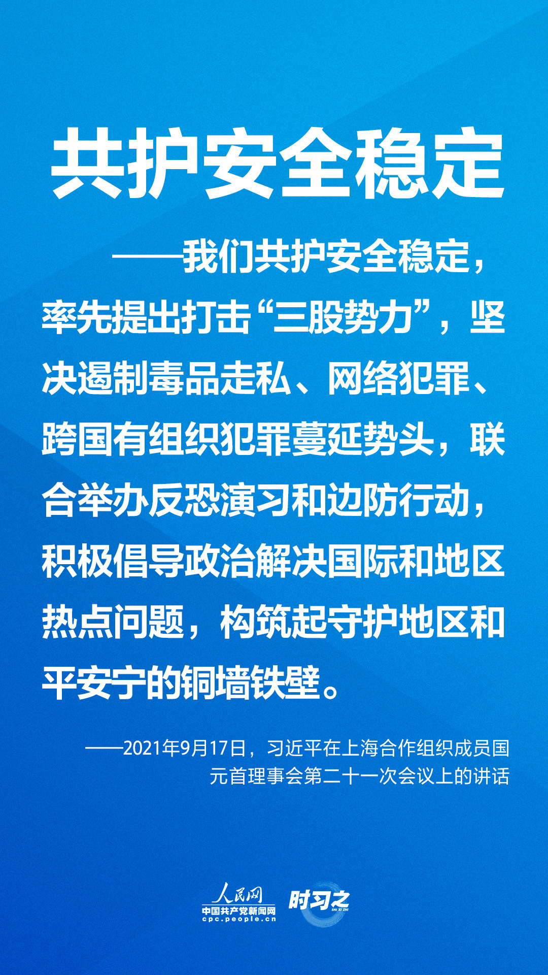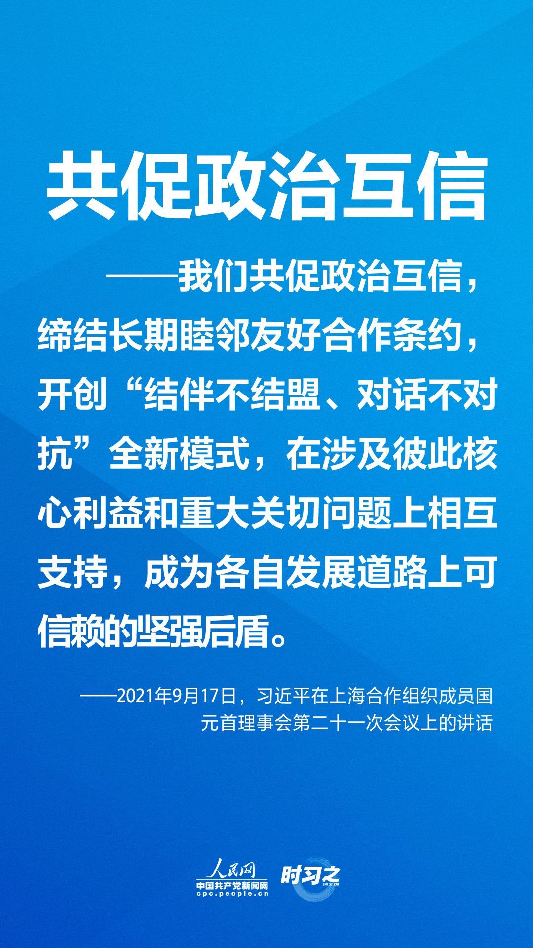 9月17日下午,国家主席习近平在北京以视频方式出席上海合作组织成员国元首理事会第二十一次会议并发表重要讲话。他指出,上海合作组织成立20年来,始终遵循“互信、互利、平等、协商、尊重多样文明、谋求共同发展”的“上海精神”,致力于世界和平与发展和人类进步事业,为构建新型国际关系和人类命运共同体作出重要理论和实践探索。