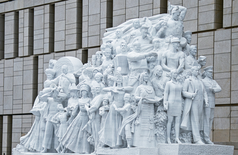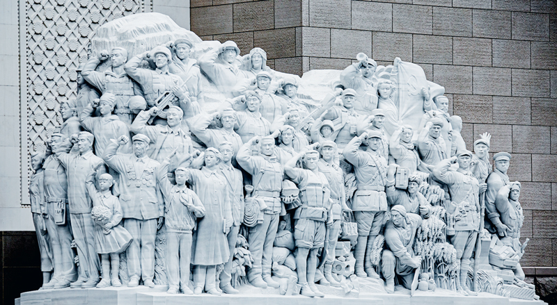 中国共产党历史展览馆西侧广场上矗立的《信仰》、《伟业》、《攻坚》、《追梦》四组大型雕塑,分别对应“四个伟大”主题,276个人物与583块汉白玉融为一体,讲述着中国共产党100年来为人民谋幸福、为民族谋复兴的奋斗历程。雕塑《信仰》中71位不同时代、不同身份、不同年龄的代表人物庄严宣誓的场景,集中展现了中国共产党人不忘初心、披荆斩棘、继往开来,团结带领全国各族人民朝着实现中华民族伟大复兴坚毅前行的豪情壮志。 刘新武/摄