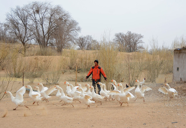 第三代治沙人郭玺在八步沙饲养家禽。人民网 王文嘉摄