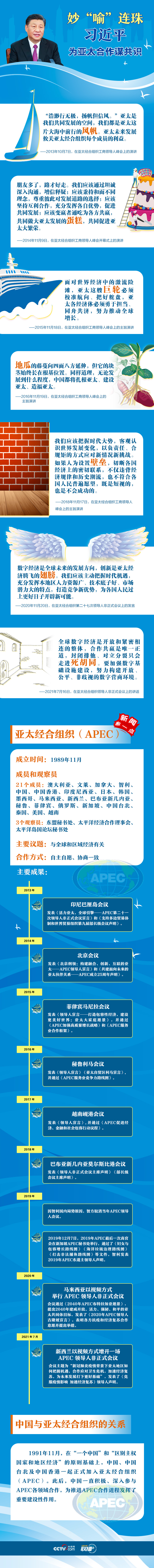 APEC作为亚太地区覆盖面积最广、纳入成员最多、包容性最强的区域经济合作组织,是构建亚太命运共同体的理想平台。2013年以来,习近平主席多次出席APEC会议并发表精彩演讲。从共创美好亚太到共筑亚太梦想,再到深化命运共同体意识,习主席多次妙“喻”连珠,深刻阐释亚太合作的重要性,为亚太合作指引方向。