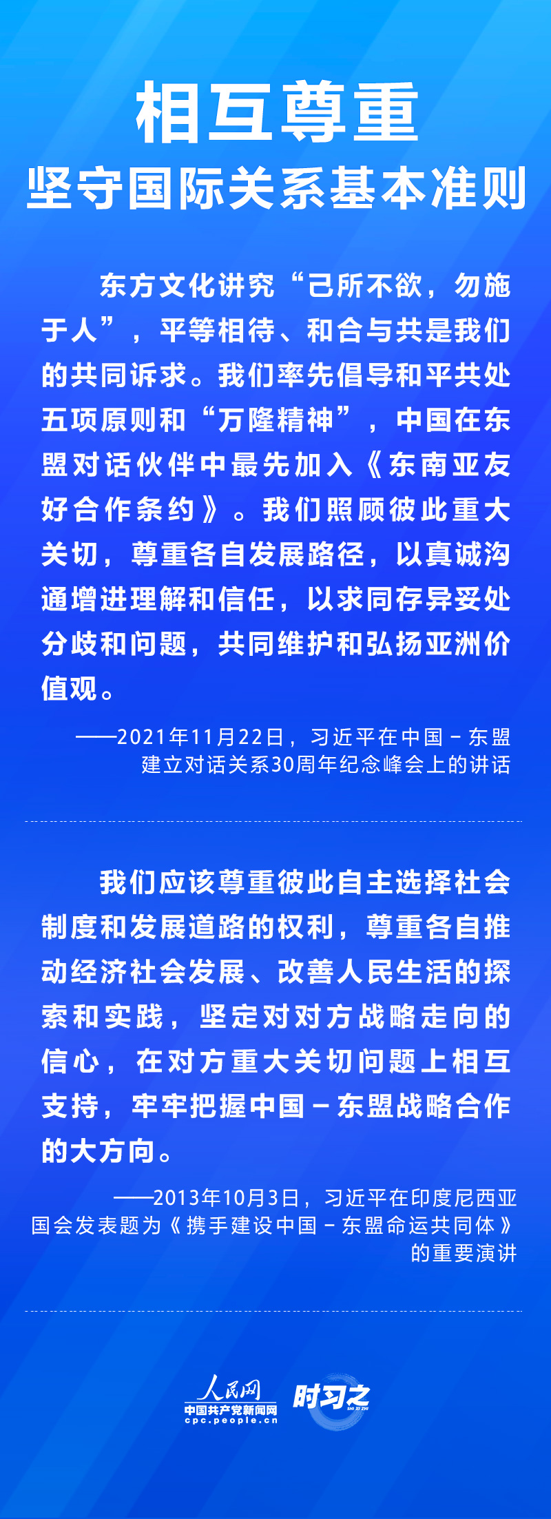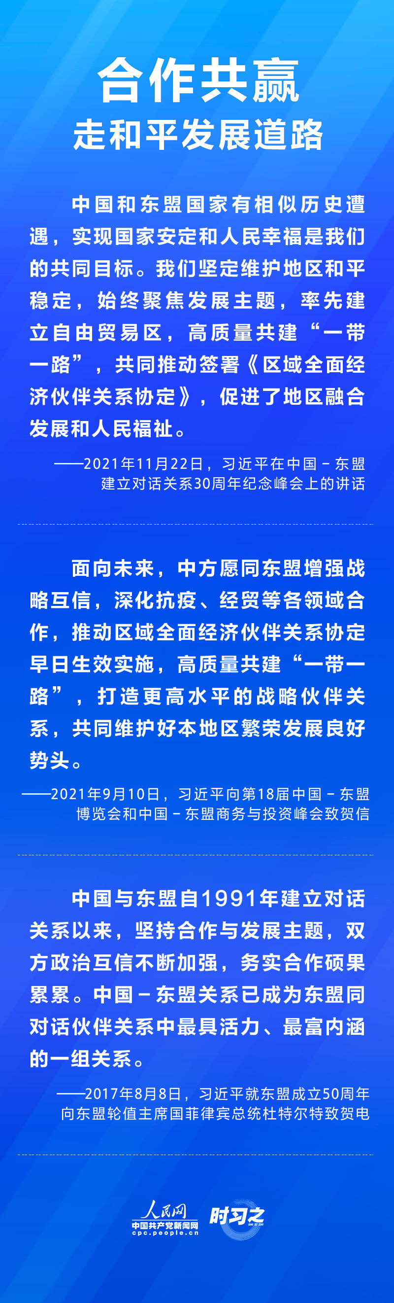 11月22日,国家主席习近平在北京以视频方式出席并主持中国-东盟建立对话关系30周年纪念峰会,发表题为《命运与共 共建家园》的重要讲话。在讲话中,习近平总结了30年来中国东盟合作的重要成就及宝贵经验,强调构建更为紧密的中国-东盟命运共同体。