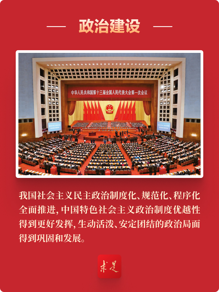 “党的十八大以来,我国社会主义民主政治制度化、规范化、程序化全面推进,中国特色社会主义政治制度优越性得到更好发挥,生动活泼、安定团结的政治局面得到巩固和发展。”