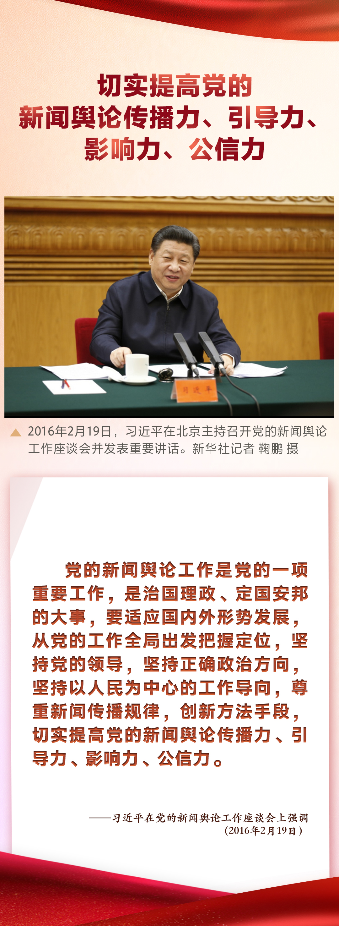 党的十八大以来,习近平总书记高度重视党的新闻舆论工作。2016年2月19日,习近平主持召开党的新闻舆论工作座谈会并发表重要讲话 ,强调切实提高党的新闻舆论传播力、引导力、影响力、公信力,为做好新闻舆论工作指明了前进方向。
